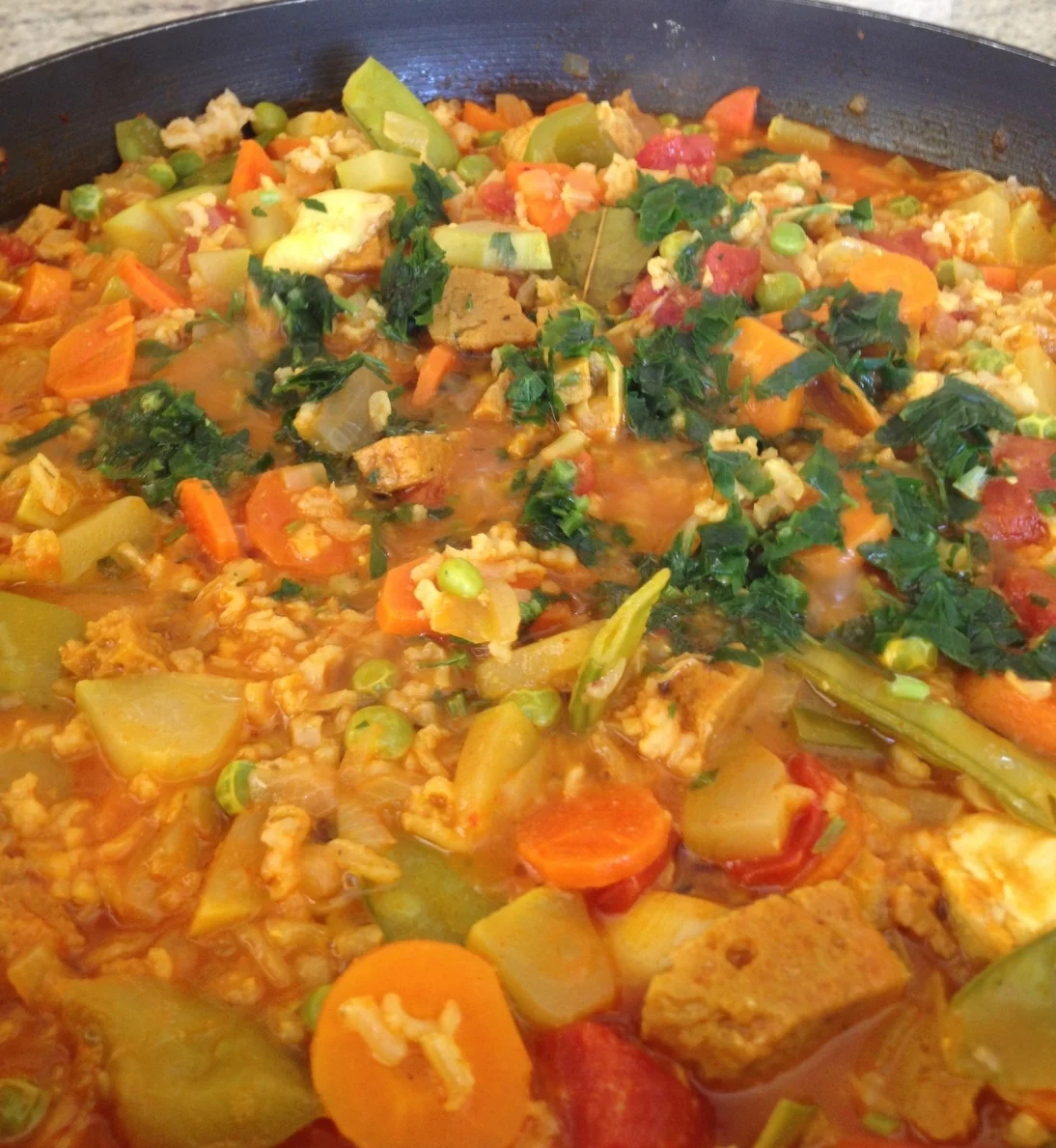 Saute oil, onion, pepper 2 min. Med-high heat. Add garlic, stir and saute a minute, add tomatoes and bay leaf, chopped gluten or tofu and stir, continue sauteing 2 minutes. Now add all the veggies, salt and seasoning. Cover 5 minutes or so while cooking. Add rice. Stir. Cover 2 more minutes. Taste test. Add parsley and serve with whole wheat french bread or any other whole grain yummy bread and salad!